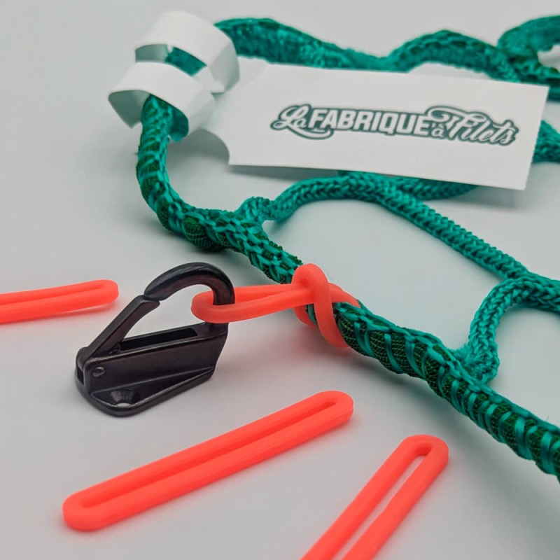 Son utilisation est très simple : réalisez une boucle autour du filet avec une attache Safe-Gum®, puis fixez votre accessoire principal (mousqueton, platine ou autre système) sur cette boucle.