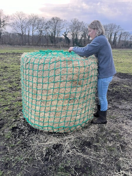 Filet à foin pour balle ronde idéal pour chevaux, poneys, ânes. En polypropylène vert résistant, ce filet à foin assure les fonctions anti gaspillage et slow feeding grâce à ses mailles étroites tout en étant suffisamment large pour que l'animal puisse se nourrir.