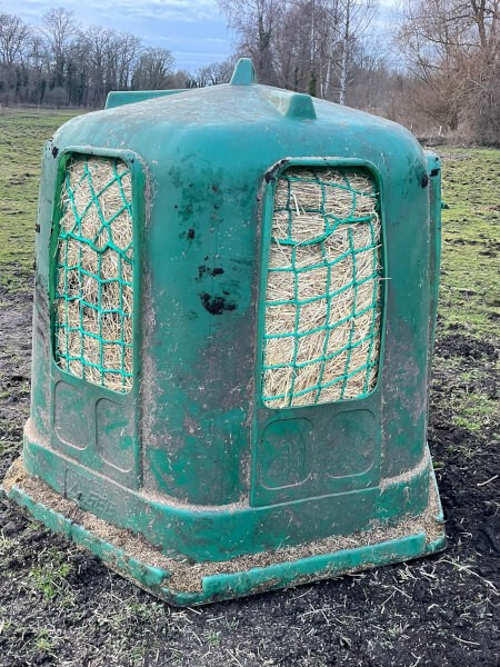 Attention pour la maille 100 mm : Pour éviter les risques que le cheval ne se coince le pieds ou le fer dans une maille, utilisez le filet avec un contenant à base fermée en dessous de type râtelier, cloche…