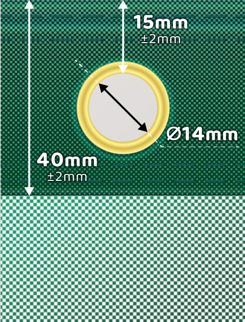 Finition haut de gamme avec bandelette PEHD renfort au pourtour (4 côtés) et œillets posés tous les 25 cm ou 50 cm selon votre choix.