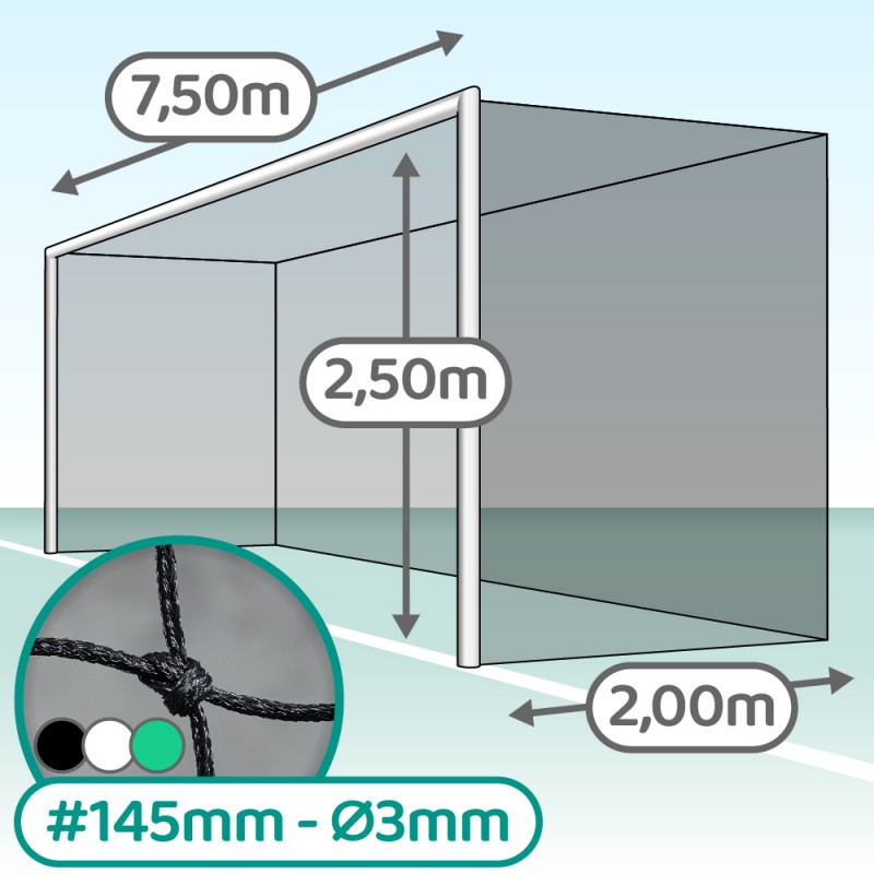 Filet de but de foot "club" confectionné en mailles carrées de 145 mm avec un fil polyéthylène tressée noué de 3 mm de diamètre.
