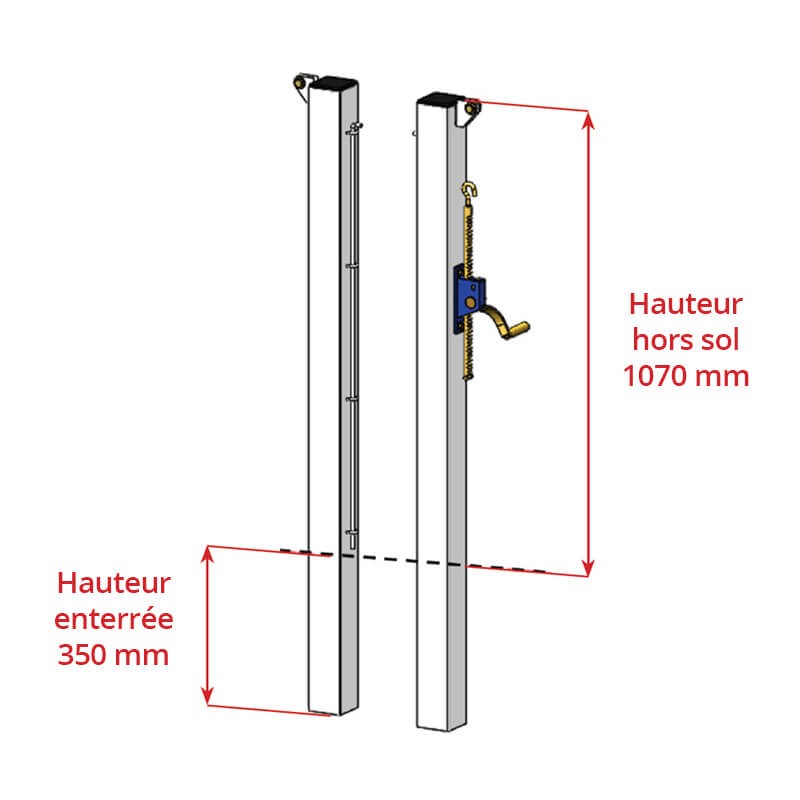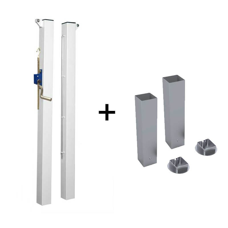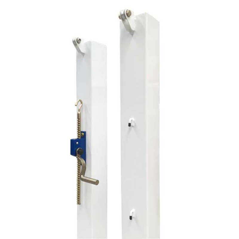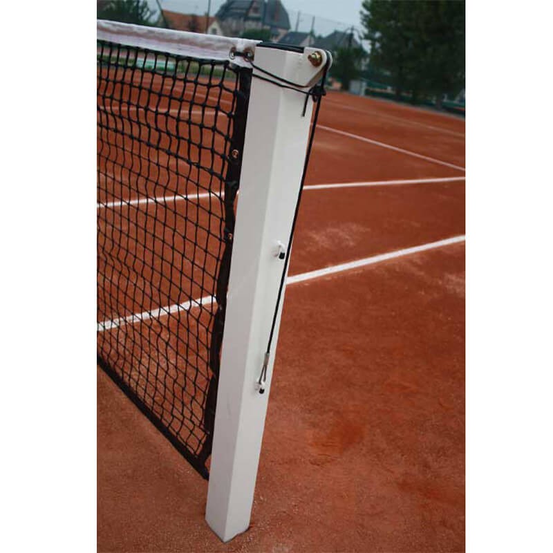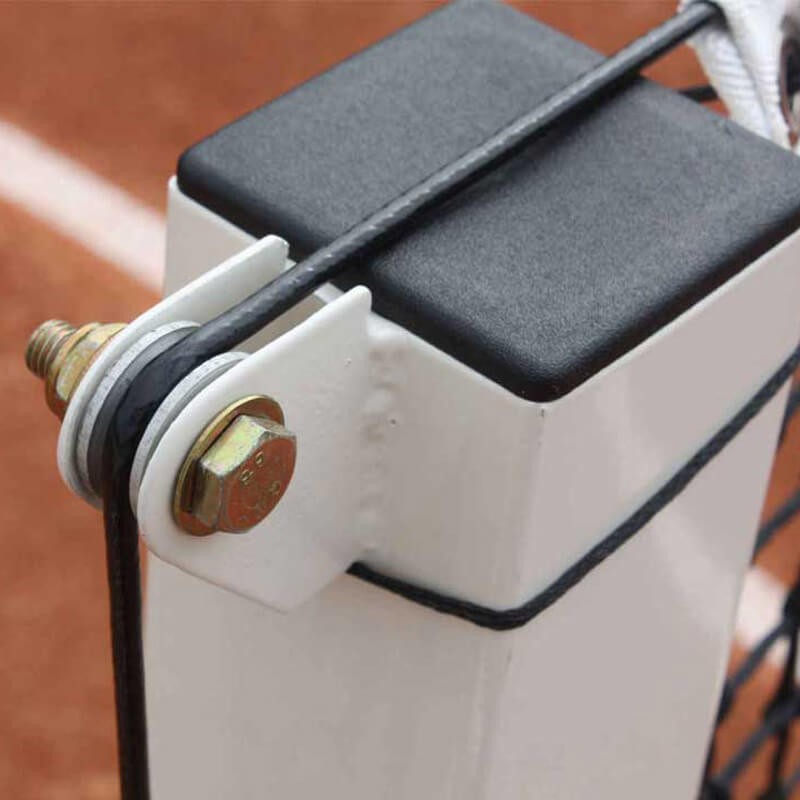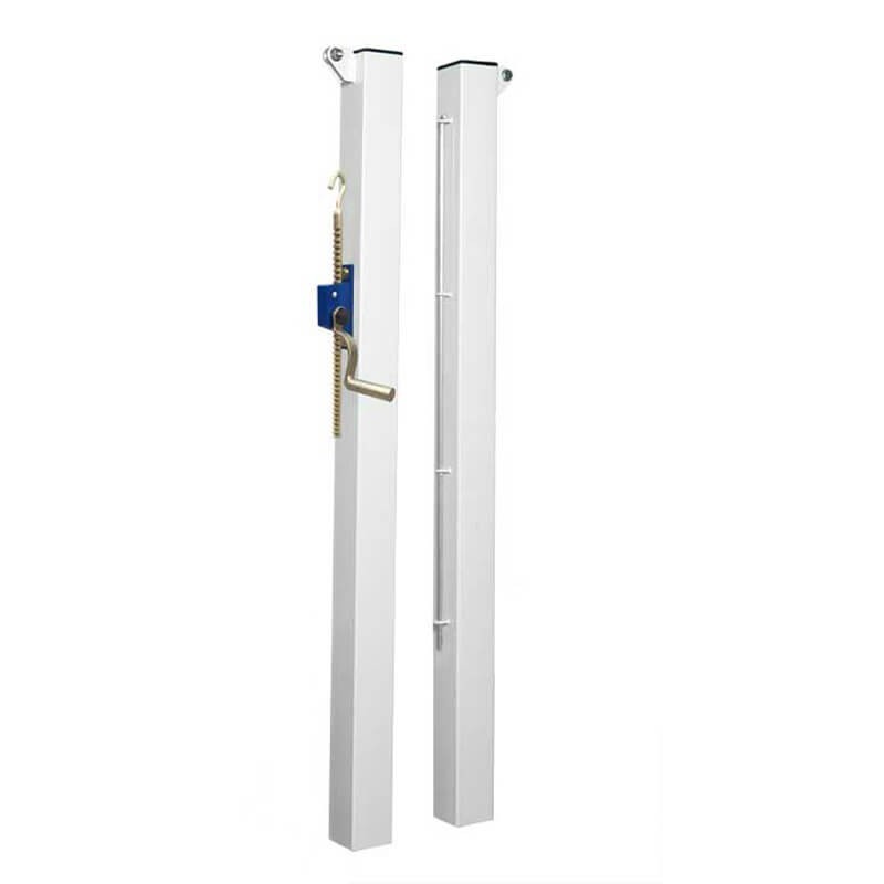 Poteaux anti-corrosion, carrés de 80 x 80 mm et de hauteur 1,07 mètre (hors-sol), avec un système de tension du filet rapide et résistant par treuil et manivelle extérieurs. Équipés de barres de cadrage en aluminium verticales sur la hauteur du poteau pour fixer le filet efficacement.