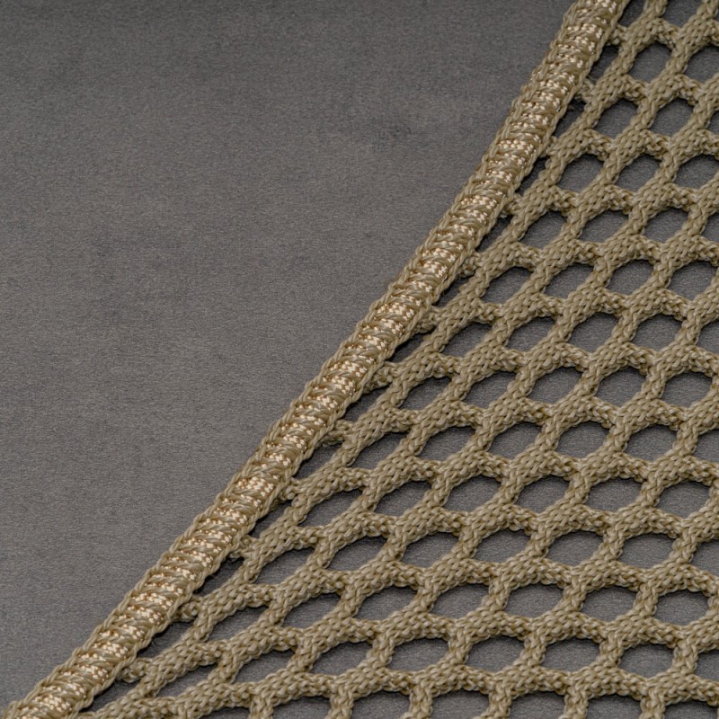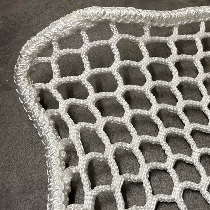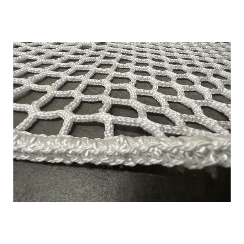 Ce filet suspendu est équipé d'une ralingue en polypropylène de 10 mm de diamètre, blanc ou noir, en fonction de la couleur du filet. Elle est passée entre toutes les mailles du filet et entièrement cousue au pourtour.