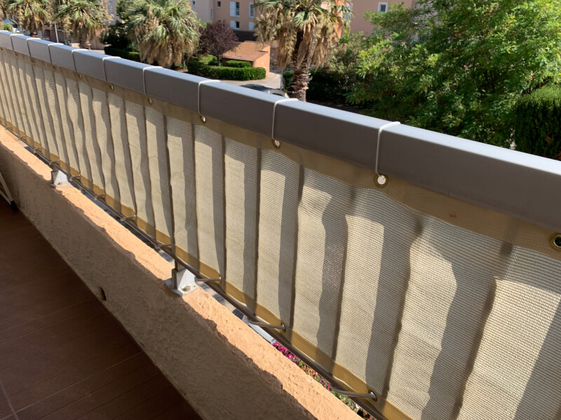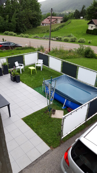Description : Avant-Après de la pose du Filet brise-vue Occultation très forte (± 95%) - Couleur : Ivoire, Finition : Oeillets tous les 25 cm. J'ai utilisé du sandow 8mm noir pour le fixer aux barrières. Très très heureuse du résultat.