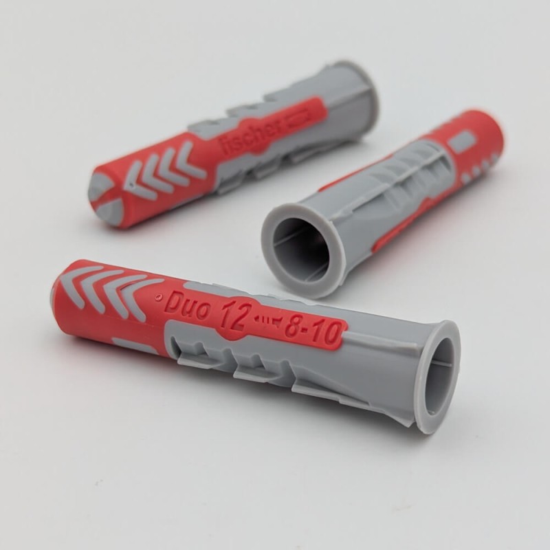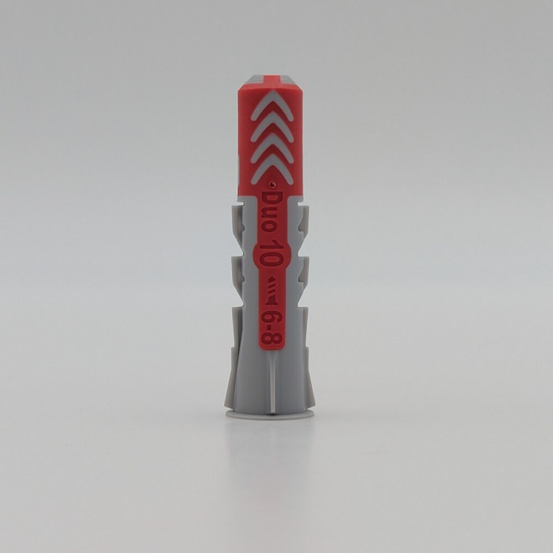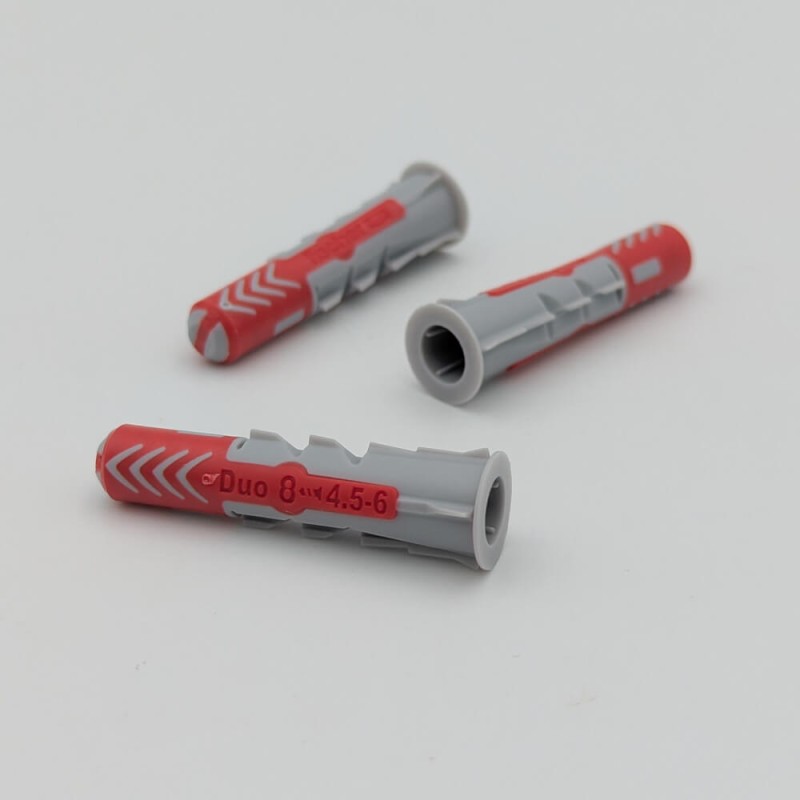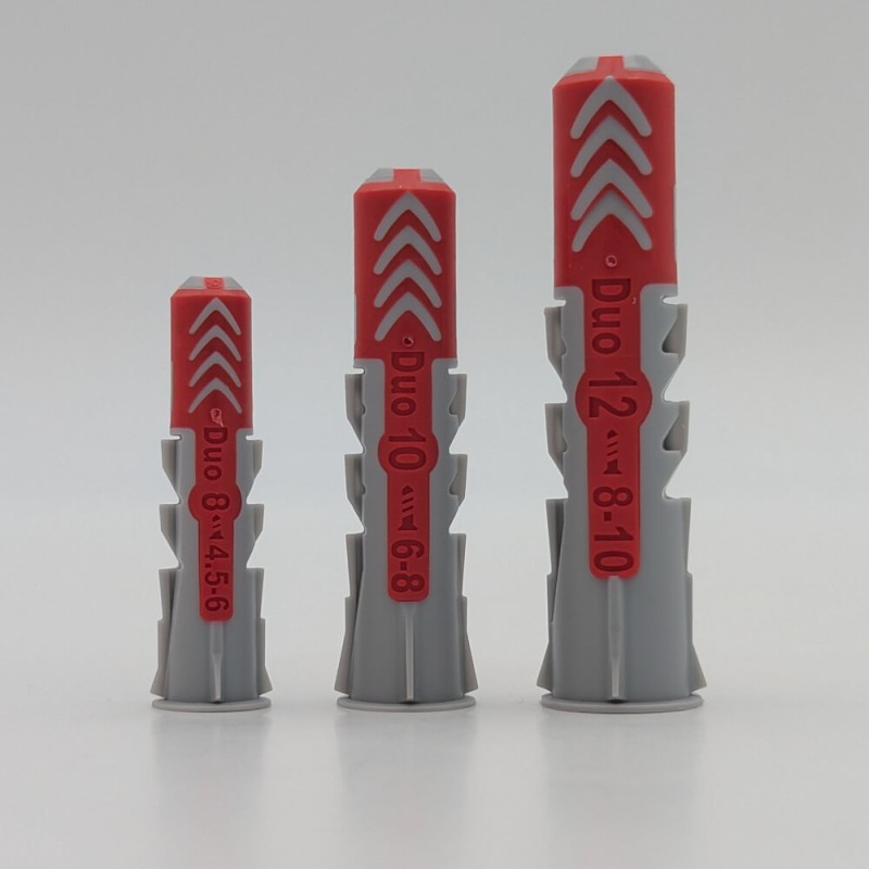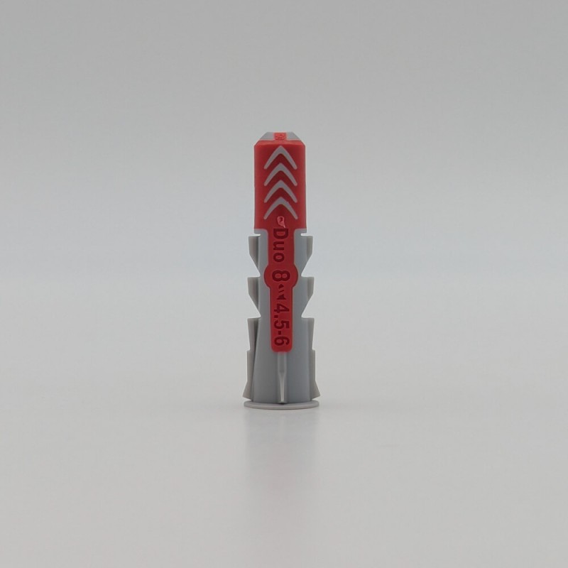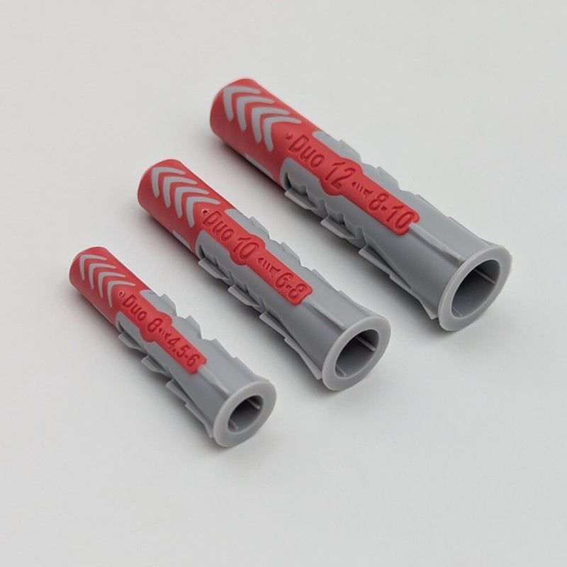 La DuoPower est une cheville bi-matière (technologie 2K) qui réagit différemment selon le support rencontré — pas besoin de choisir la bonne cheville avant de percer :